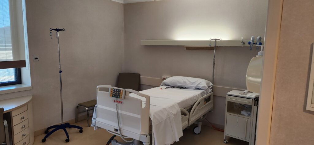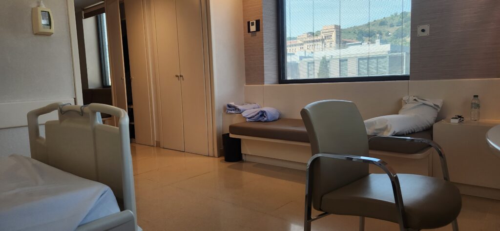 The procedure here is quite different than the hospital in Canada. In Canada I would need to register and then change and sit in a room by myself in the cold for hours. Last time they told me that I could not bring my cell phone and I sat there for a couple of hours in the cold. You answer some quick questions with a nurse but otherwise you are in a gown with a blower that circulates hot air. When it is almost time you go to another area and wait prior to your procedure. Here in Spain we have one of the nicest rooms on the floor. There is a tiered Healthcare system here where you can get public healthcare for free and pay private insurance to access a private hospital like this. Mel thinks that since we are an international patient that we may have the nicer room. Apparently some insurances you can get a package that includes flight. I am not sure that if i has surgery if I would want to travel economy. The procedure here was I had my own translator and it seemed like I skipped most of the lines and had bloodwork and then I got admitted into my own private room where I got to hang out until they were ready for me. They came to my room to check up and they shaved my stomach in my washroom. I was scheduled to go in at 3:30 but with all the delays I went in at 5:45. We had waited from approximately 2pm till that time, but it was a comfortable wait. We then went to another area where I went to a prep area where they inserted my IV. They are just as bad here as in Canada and it took them 3 times to get it in. After waiting my turn for a bit I was then rolled over to the OR area where it seems like they just had a very long hallway of suites. They all seemed quite high tech. I am not sure what time it started but I got out of my room by 11:30pm. Mel had spoken to the doctor’s and they confirmed that I may not need further PIPAC. We will see though when we chat with the doctors and confirm the results.
